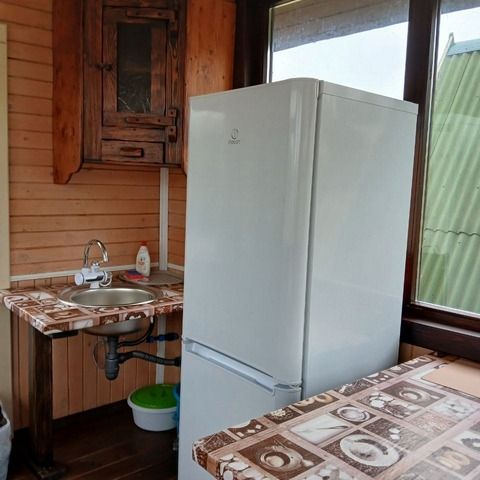 Кухня закрытая с панорамными окнами, оснащена холодильником, микроволновкой, плитой, кухонными принадлежностями и утварью, раковиной и баком для воды.